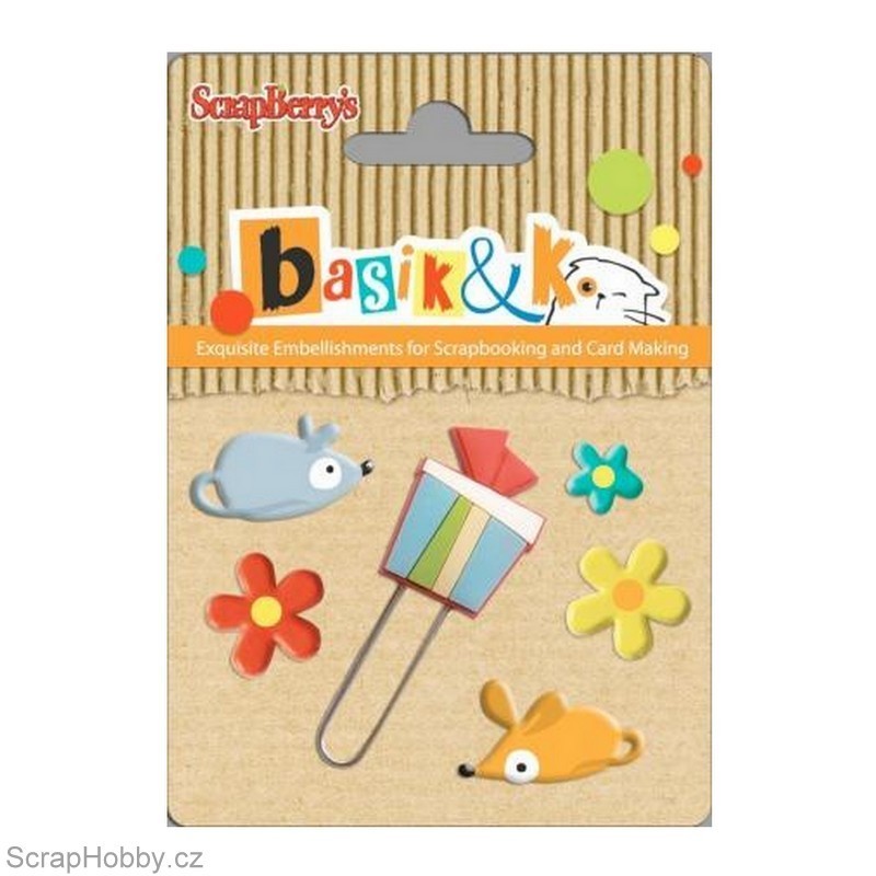 Sada obsahuje 5ks hřebíčků s motivem myšek a kytiček a jednu kancelářskou svorku.