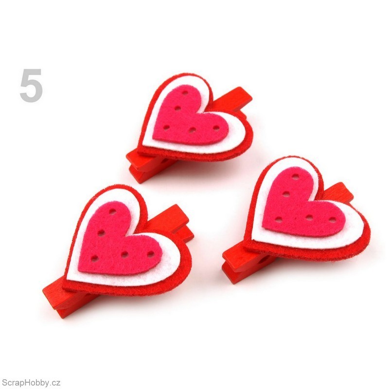 Kolíčky jsou dřevěné s filcovou dekorací srdíček.