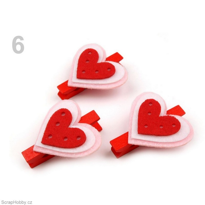 Kolíčky jsou dřevěné s filcovou dekorací srdíček.