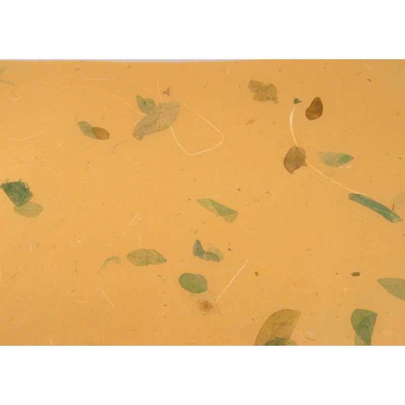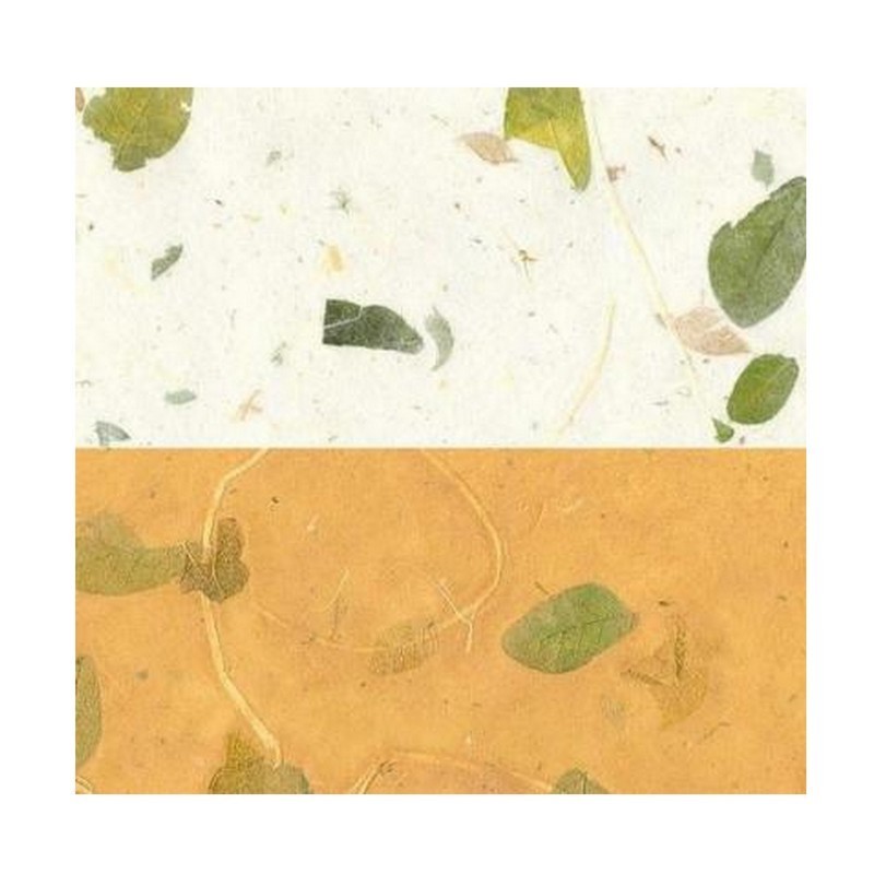 Morušový papír s lístky a vlákny, velmi dekorativní, neobsahuje kyselinu ani lignin, vhodné k archivaci.