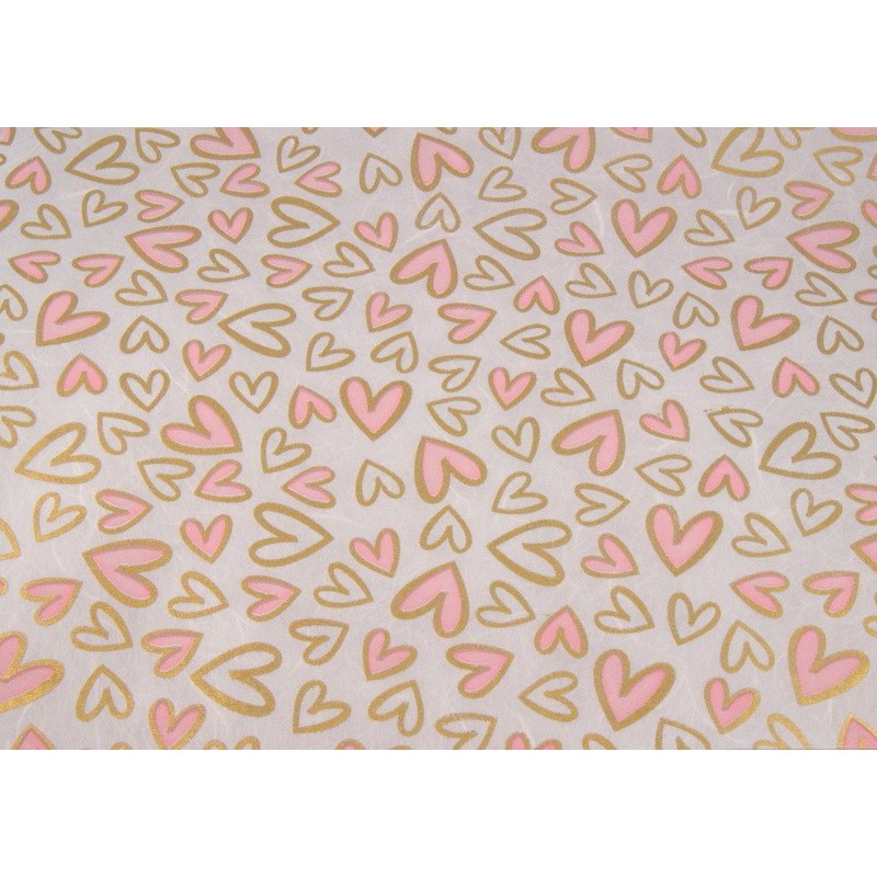 Morušový papír strojně čerpaný s vlákny moruše, zlatými a růžovými srdíčky.