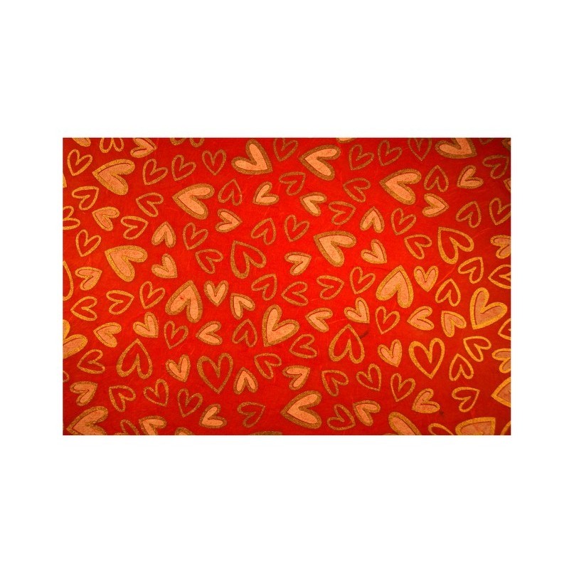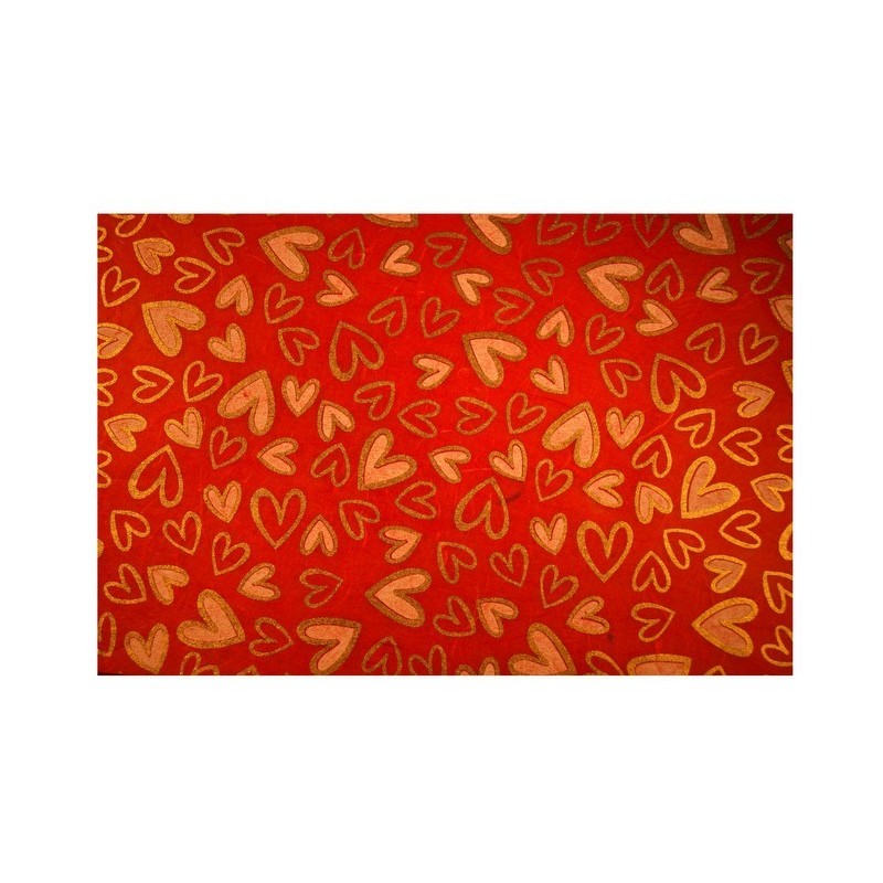 Morušový papír strojně čerpaný s vlákny moruše, zlatými a růžovými srdíčky na červeném podkladu.