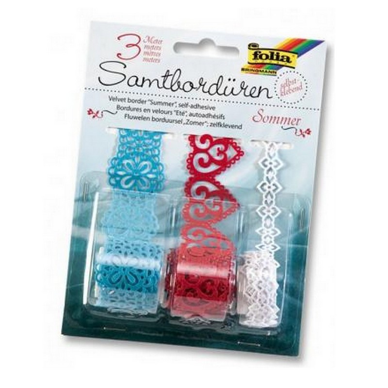 Balení obsahuje 3 druhy samolepících krajek s vrchním sametovým povrchem, každá krajka je v jiném dekóru - viz obrázek o délce 1m.