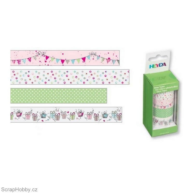 Mírně průsvitná samolepicí papírová (krepová) páska s potiskem na dekorování papíru.