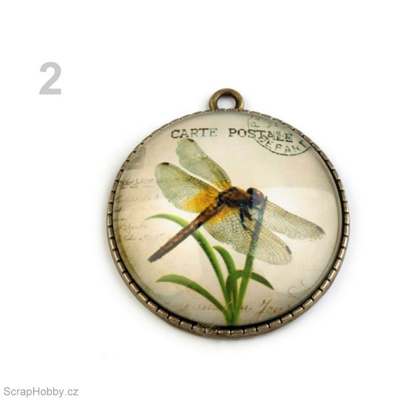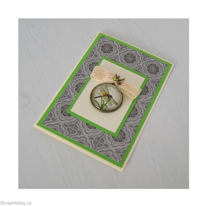 POPIS: Průhledný kabošon je zasazený v kovovém lůžku. Kabošon má tvar vypouklé čočky. Okraj lůžka je zdobený reliéfy, má barevnou staromosaznou patinu. Zadní strana je zdobená drobnými lístky.