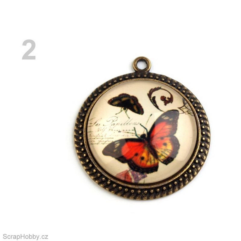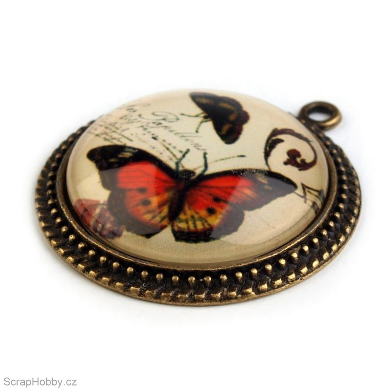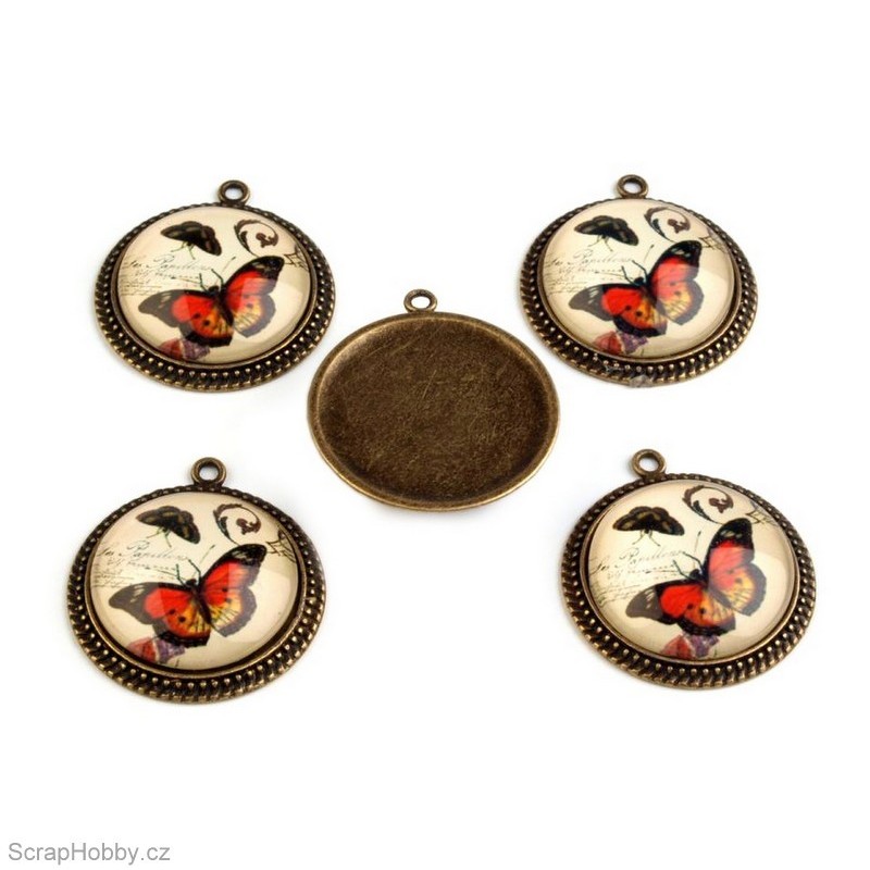 POPIS: Průhledný kabošon je zasazený v kovovém lůžku. Kabošon má tvar vypouklé čočky. Okraj lůžka je zdobený reliéfy, má barevnou staromosaznou patinu.