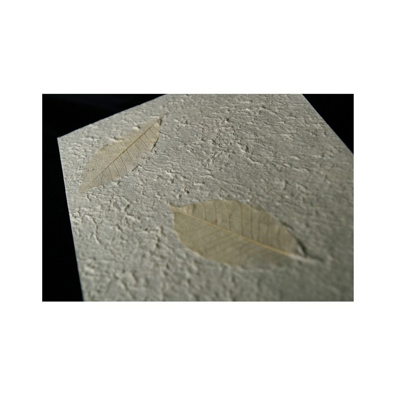 Ruční papír s hrubou strukturou a vlisovanými částmi rostlin.